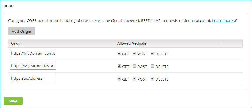 An origin for matching cross-server RESTish API requests under the account. The matching criteria specified for an origin are protocol (HTTP or HTTPS), originating domain, and originating port. A matching request is one that matches on all criteria.