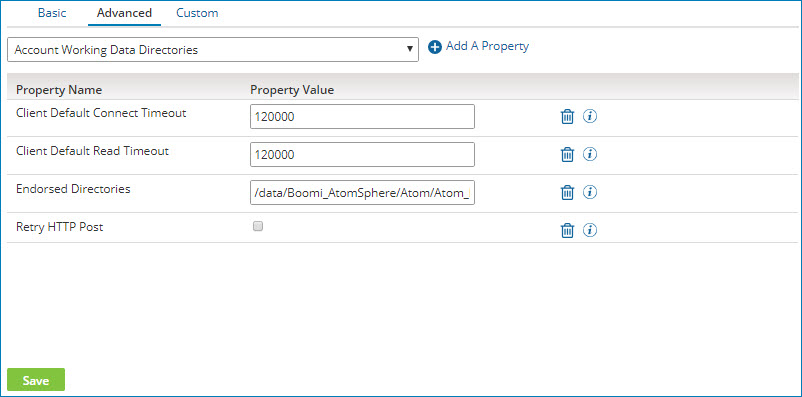 noteThe properties that you see are those that were in effect when the Atom or private runtime cloud started. Properties are displayed regardless of how they were set — through the UI or manually by editing the